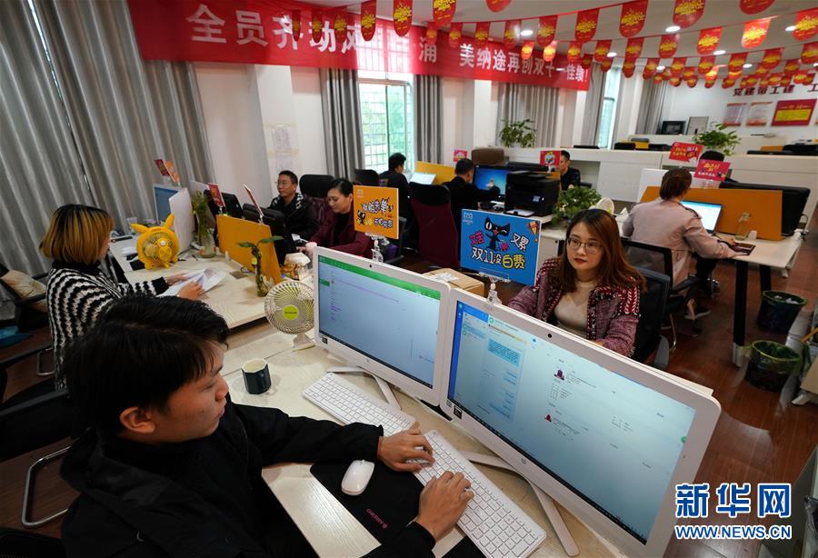 11月3日,貴溪市美納途箱包公司的客服人員在接受客戶咨詢。該公司推出的“雙十一”購物節(jié)預(yù)售活動已經(jīng)開始。新華社記者宋振平攝
