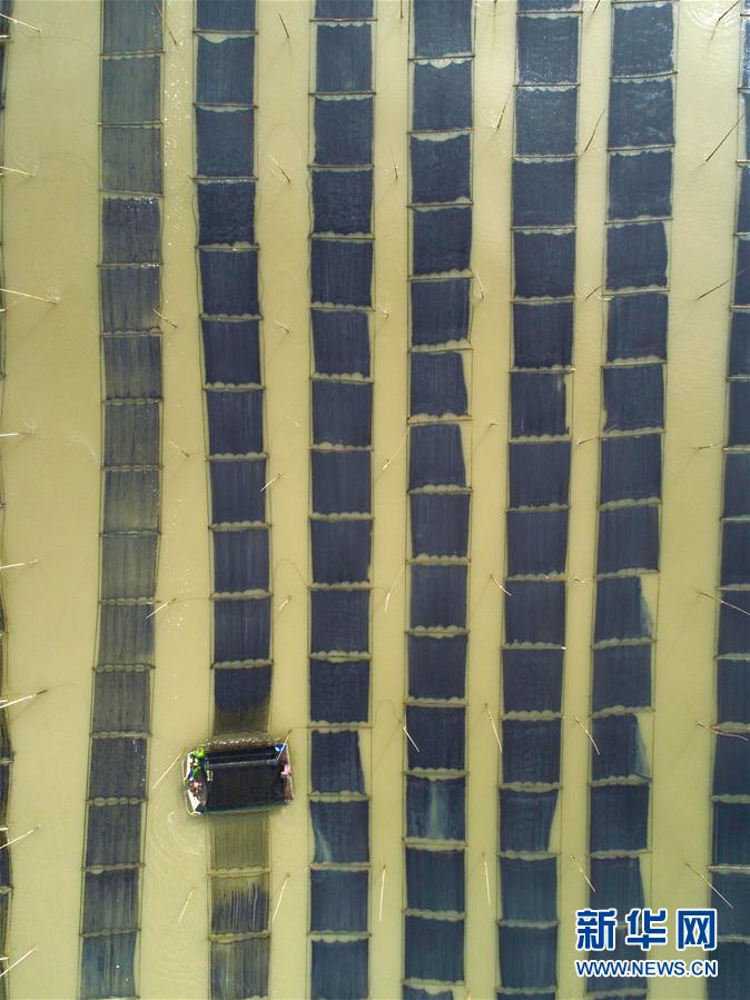11月4日,漁民在霞浦縣三沙鎮(zhèn)的紫菜種植區(qū)收獲紫菜(無(wú)人機(jī)拍攝)。 近日,福建省霞浦縣沿海6萬(wàn)畝紫菜迎來(lái)收獲季節(jié),漁民們出海收獲紫菜,海上田園一派繁忙豐收景象。 新華社記者 姜克紅 攝