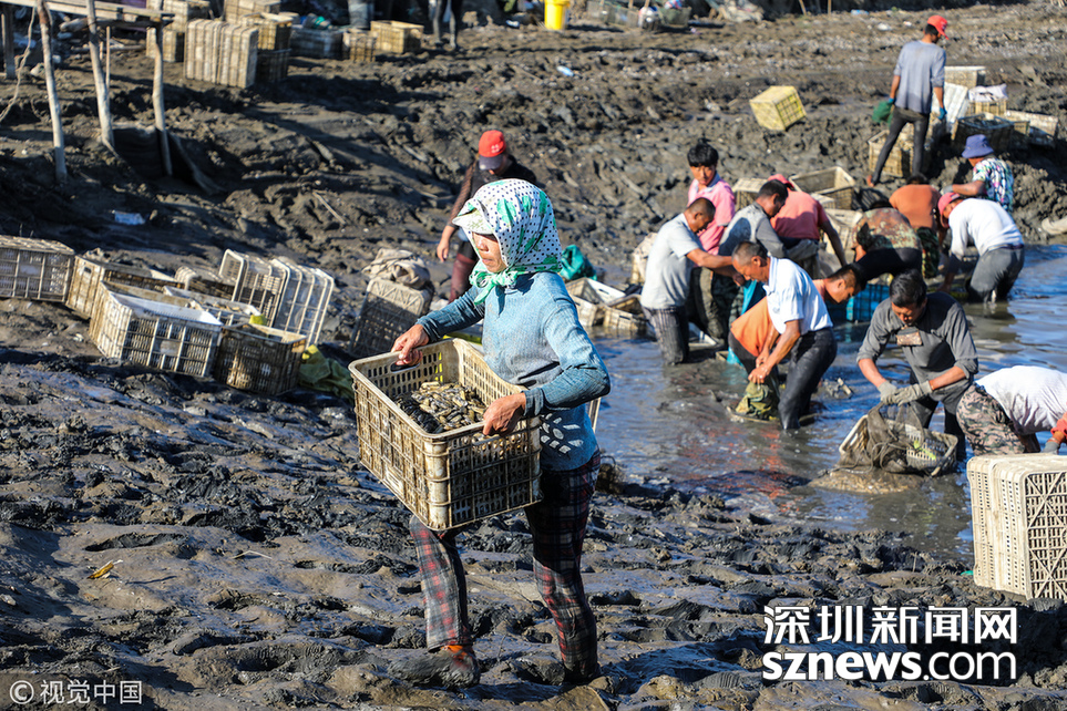 深圳新聞網(wǎng)訊 2018年9月8日,遼寧丹東,早上5點,挖蟶人紛紛下到各個池子,要在海水海泥里艱辛勞作10小時,直至下午3點集體上岸,等待買家的運輸車隊運走他們的勞動成果。9月初,遼寧沿海養(yǎng)殖區(qū)進(jìn)入養(yǎng)殖海鮮的收獲季。在東港,常常出現(xiàn)數(shù)百人乃至上千人集結(jié)在池子里挖蟶子(這里特指縊蟶,即東港當(dāng)?shù)厝怂f的小人仙。下同)的壯觀景象。在養(yǎng)殖海鮮的收獲季,成群的海鷗趁機“助陣“,人與大自然和諧共處的畫面令人嘆為觀止。