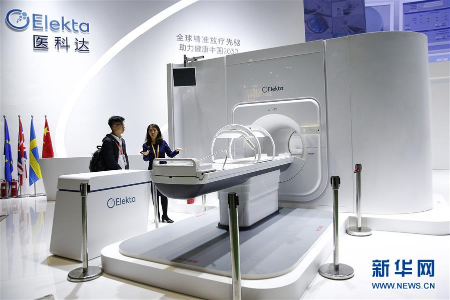11月6日,瑞典醫(yī)科達(dá)公司工作人員為一名記者介紹高場(chǎng)強(qiáng)磁共振放療系統(tǒng)Elekta Unity。該款診斷級(jí)磁共振成像系統(tǒng)與先進(jìn)的放療加速器有機(jī)結(jié)合,可以在腫瘤放療治療的過程中實(shí)時(shí)、高分辨率地顯示和追蹤腫瘤的變化。 新華社記者 張玉薇 攝