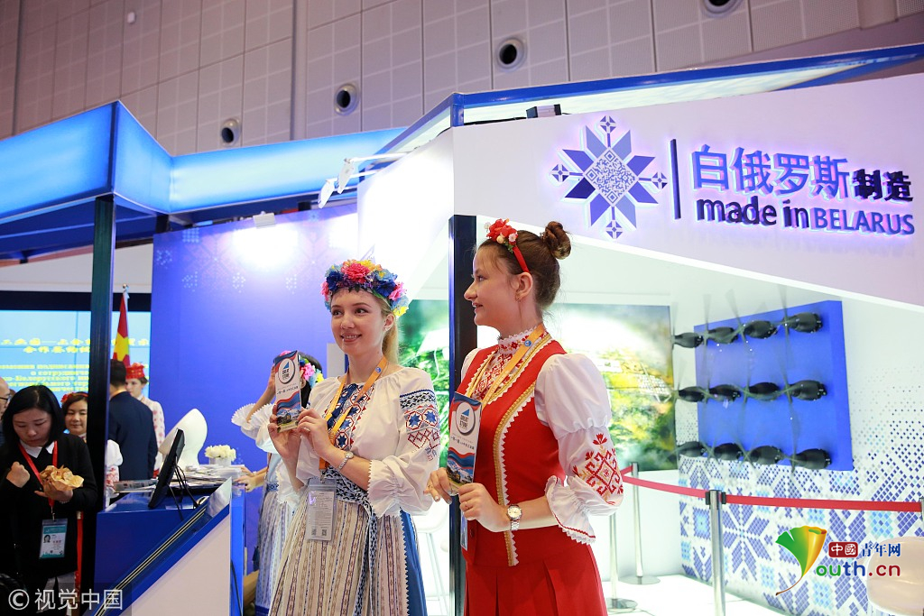 2018年11月6日,上海,首屆中國(guó)國(guó)際進(jìn)口博覽會(huì)國(guó)家展上,共有82個(gè)國(guó)家、3個(gè)國(guó)際組織設(shè)立了71個(gè)展臺(tái)。白俄羅斯館。視覺中國(guó)