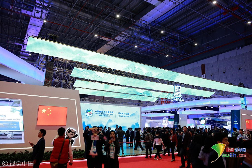 2018年11月6日,上海,首屆中國(guó)國(guó)際進(jìn)口博覽會(huì)國(guó)家展上,共有82個(gè)國(guó)家、3個(gè)國(guó)際組織設(shè)立了71個(gè)展臺(tái)。中國(guó)館。視覺中國(guó)