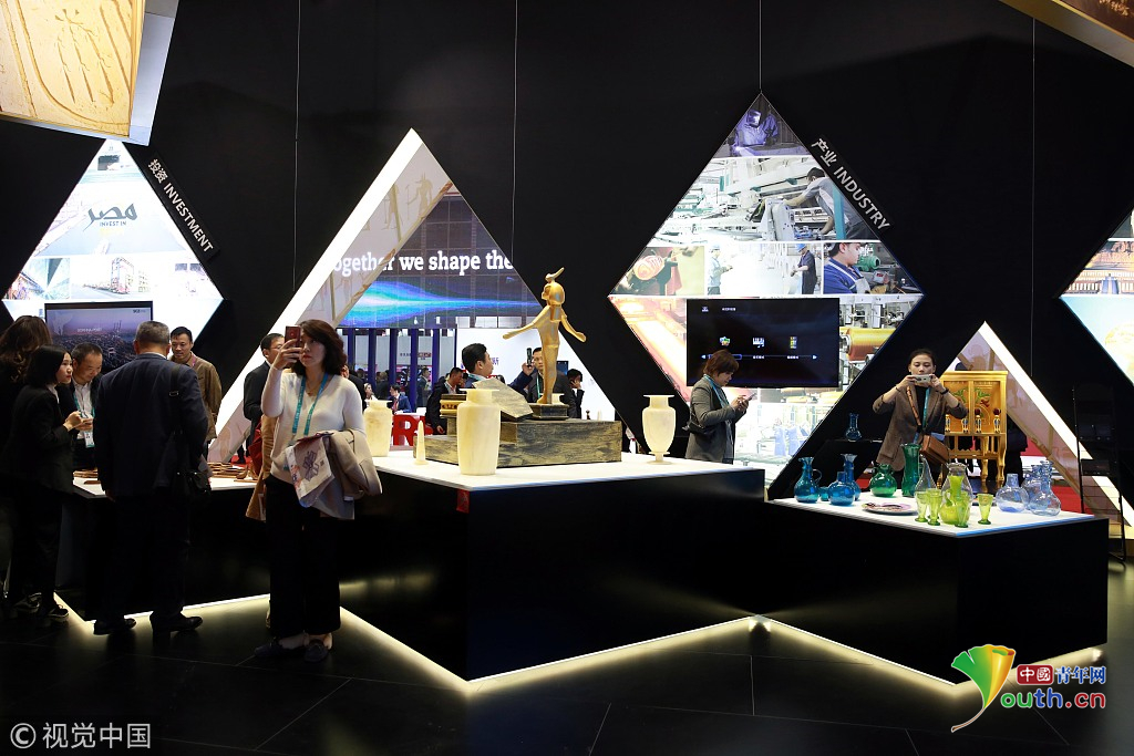 2018年11月6日,上海,首屆中國(guó)國(guó)際進(jìn)口博覽會(huì)國(guó)家展上,共有82個(gè)國(guó)家、3個(gè)國(guó)際組織設(shè)立了71個(gè)展臺(tái)。埃及館。視覺中國(guó)