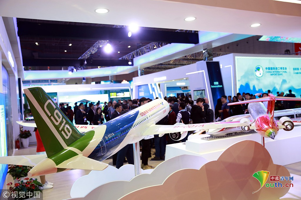 2018年11月6日,上海,首屆中國(guó)國(guó)際進(jìn)口博覽會(huì)國(guó)家展上,共有82個(gè)國(guó)家、3個(gè)國(guó)際組織設(shè)立了71個(gè)展臺(tái)。中國(guó)館展示的C919飛機(jī)。視覺中國(guó)