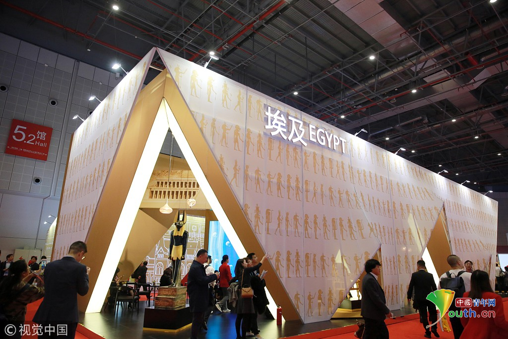 2018年11月6日,上海,首屆中國國際進口博覽會國家展上,共有82個國家、3個國際組織設(shè)立了71個展臺。埃及館。視覺中國