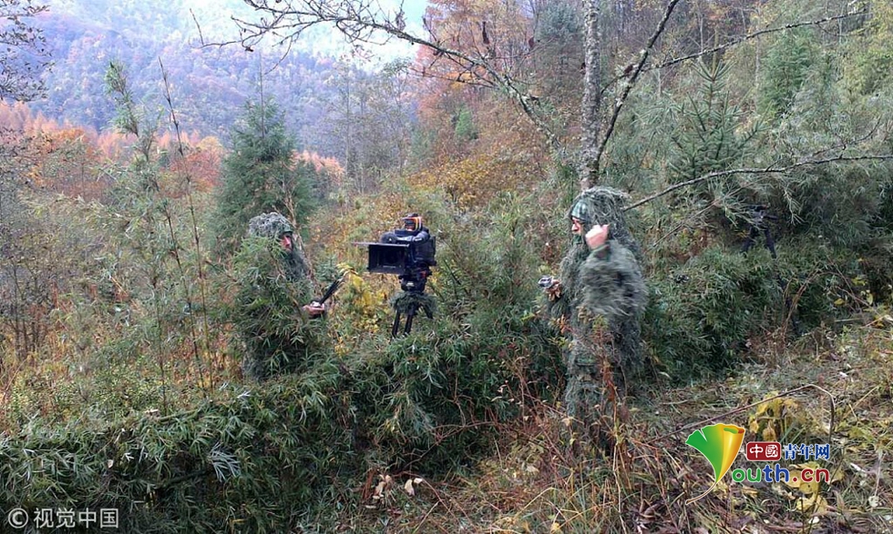 2013年11月6日,兩歲兩個月的雌性大熊貓“張想”在四川省雅安栗子坪自然保護(hù)區(qū)進(jìn)行放歸,記者“全副武裝”在現(xiàn)場采訪。(手機(jī)拍攝)圖片作者:衡毅/視覺中國