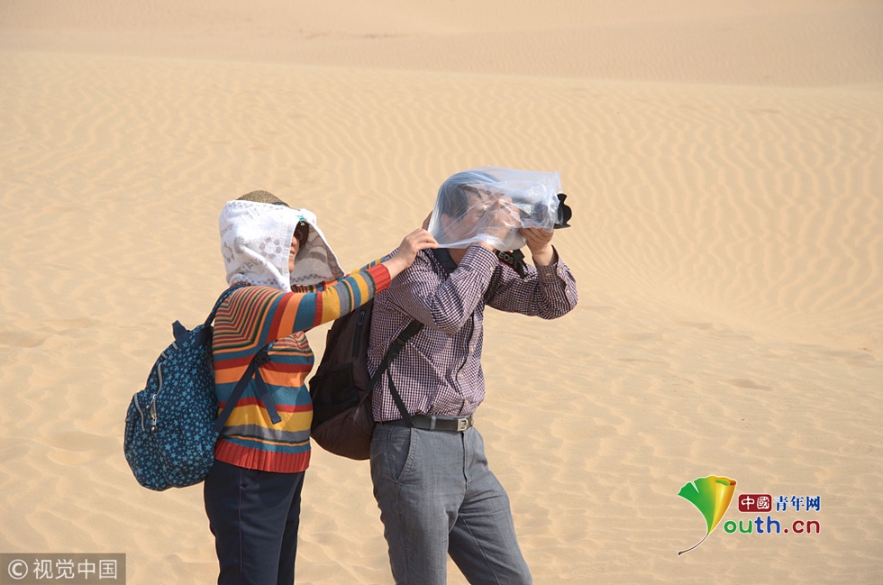 2013年05月05日,河北省張家口市,懷來天漠景區(qū)里的一名全副武裝的攝影師在風(fēng)中拍攝?!D片作者:蘇衛(wèi)忠/視覺中國(guó)