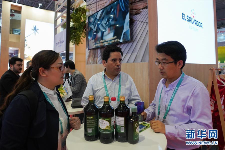 11月7日,在薩爾瓦多展區(qū),一名參觀者(左)聽取工作人員推介當?shù)厣a(chǎn)的諾麗果汁。 中國國際進口博覽會11月5日在上海開幕。國家貿(mào)易投資綜合展(國家展)是中國國際進口博覽會的重要內(nèi)容,共有82個國家、3個國際組織設立71個展臺。 新華社記者 王天聰 攝