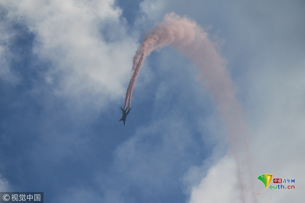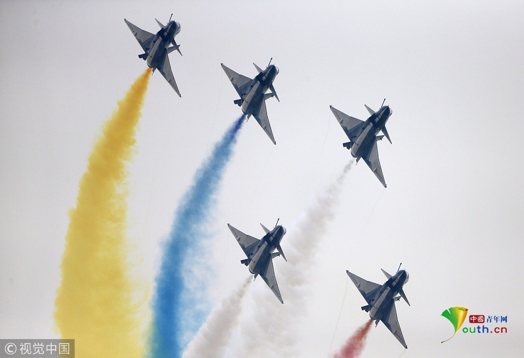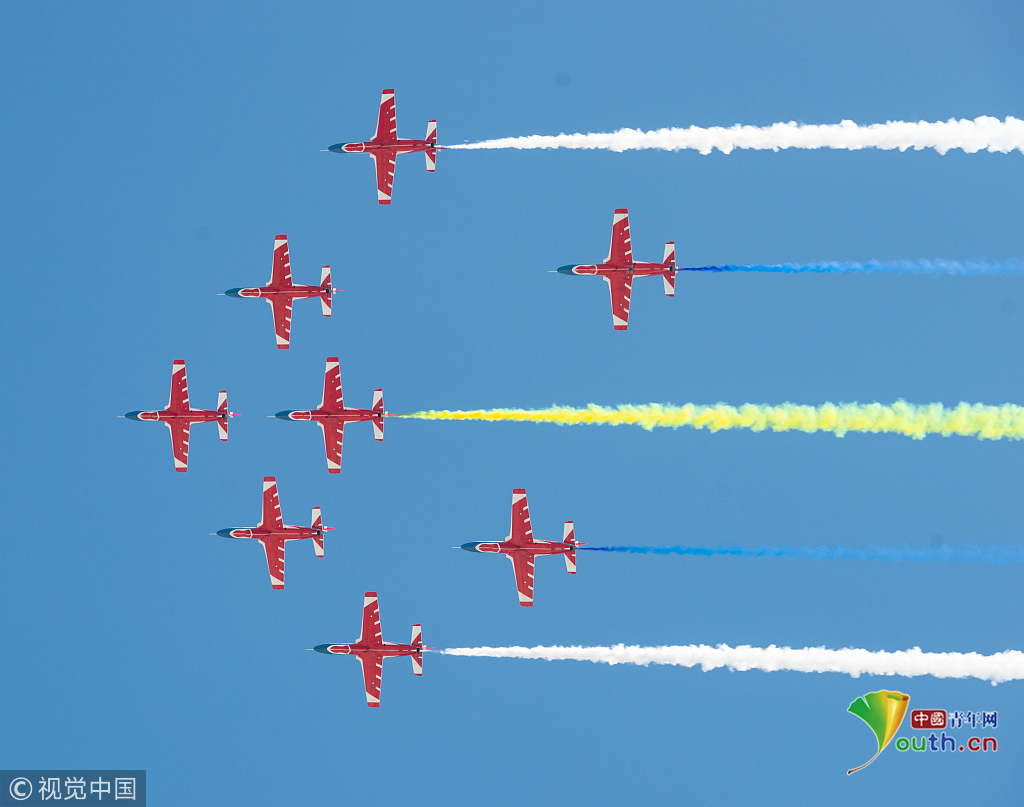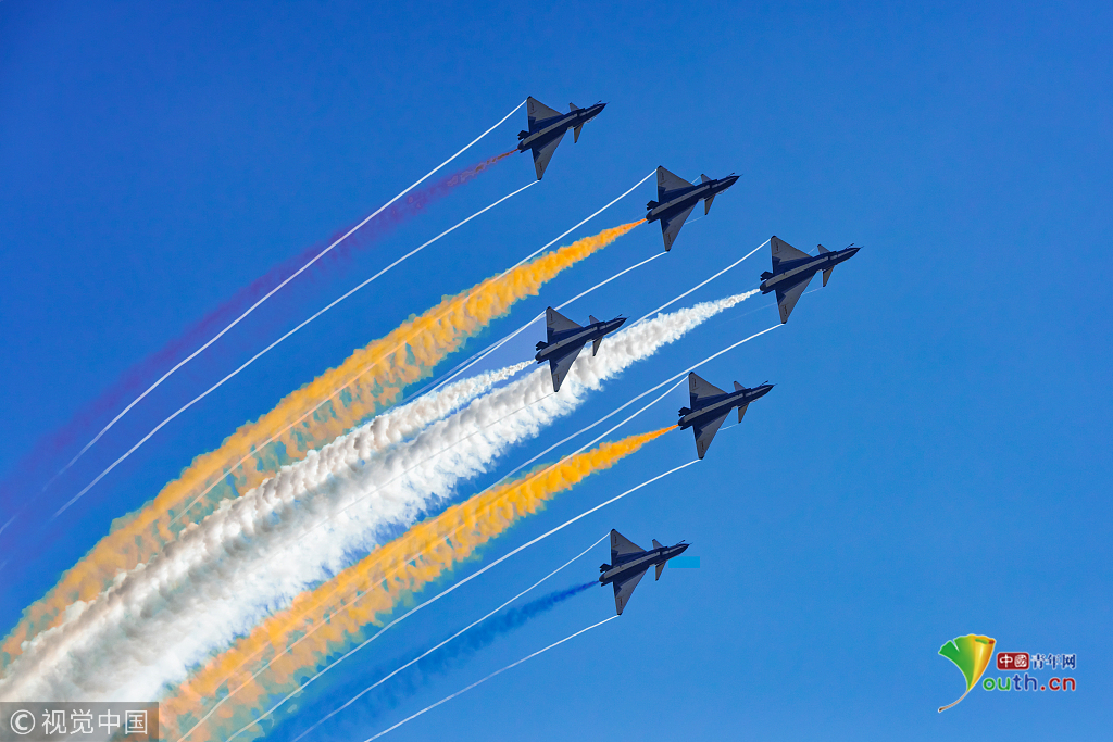 2018年11月8日,廣東珠海,第十二屆中國國際航展第三天。空軍“八一”飛行表演隊的隊員們,發(fā)揚連續(xù)作戰(zhàn)精神,給觀眾們表演了七機(jī)分組開花、四機(jī)編隊橫滾等高難動作,受到觀眾們的稱贊。視覺中國