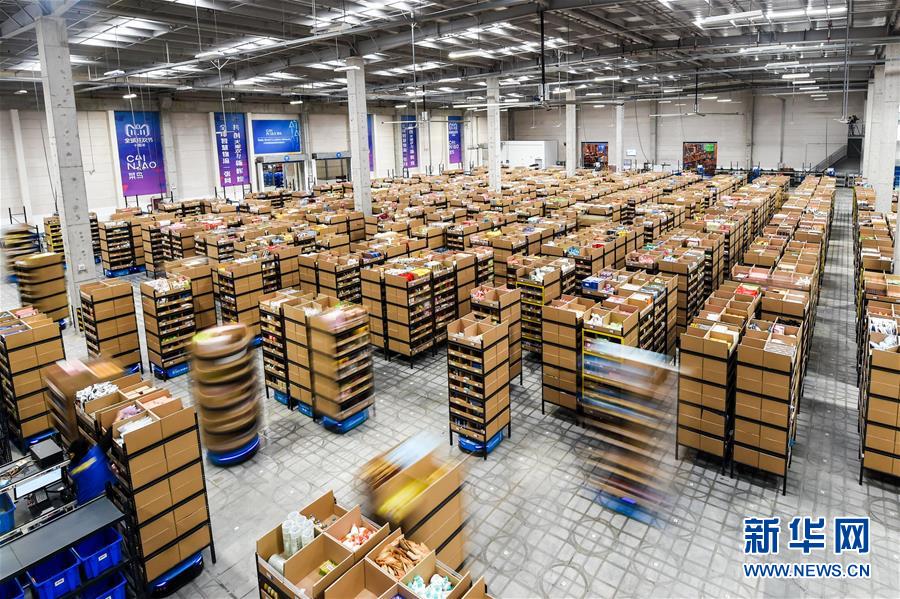 11月8日,智能搬運(yùn)機(jī)器人在倉(cāng)庫(kù)內(nèi)進(jìn)行搬運(yùn)作業(yè)。