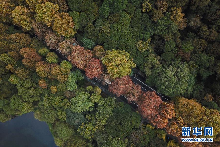 11月13日無人機(jī)拍攝的杭州西湖一景。 時(shí)值初冬,杭州市西湖景區(qū)層林盡染,色彩斑斕,別有一番韻味。