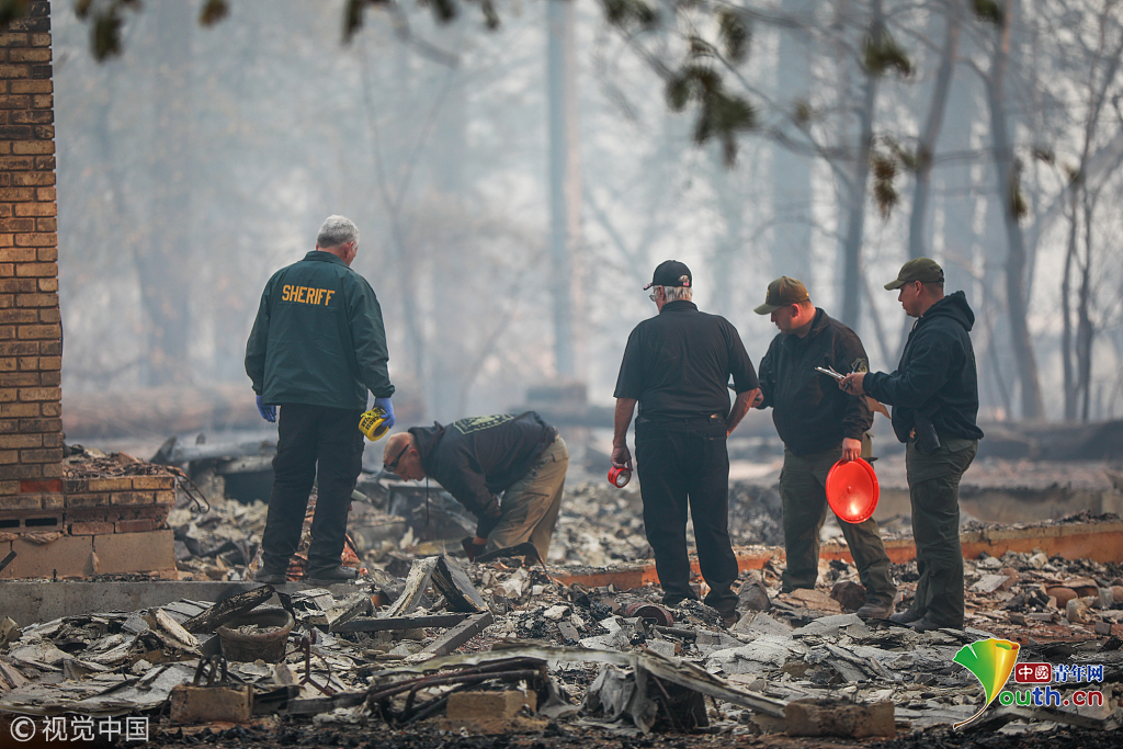 11月13日,在美國加利福尼亞州天堂鎮(zhèn),搜救人員在山火過后的廢墟工作。