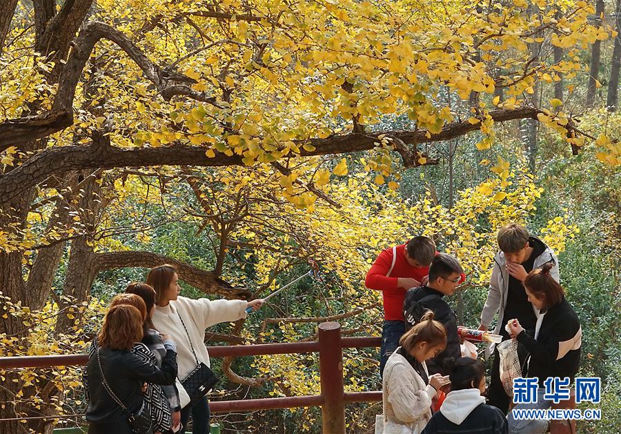 11月1日,游客在河南省嵩縣白河鄉(xiāng)下寺村古銀杏樹下拍照賞景。 深秋時(shí)節(jié),河南省嵩縣白河鄉(xiāng)下寺村的古銀杏林為小山村披上了“金甲”。漫天黃葉,遍地金色,一幢幢民居掩映在色彩斑斕的世界里,美不勝收,吸引了眾多游客賞景拍照。 新華社記者 李安 攝
