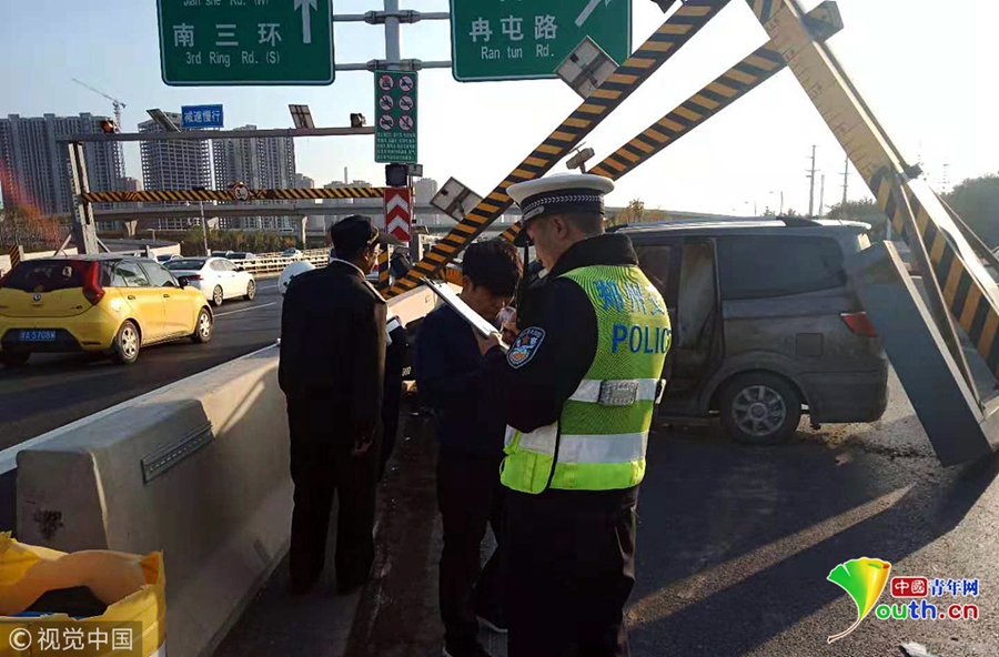 快速路司機開車“走神” 眨眼撞塌限高桿