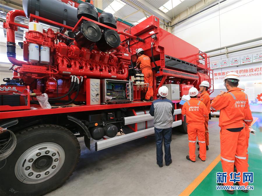 在杰瑞集團(tuán)石油裝備制造工業(yè)園,工作人員在對壓裂車進(jìn)行裝配(10月17日攝)。新華社記者王南攝