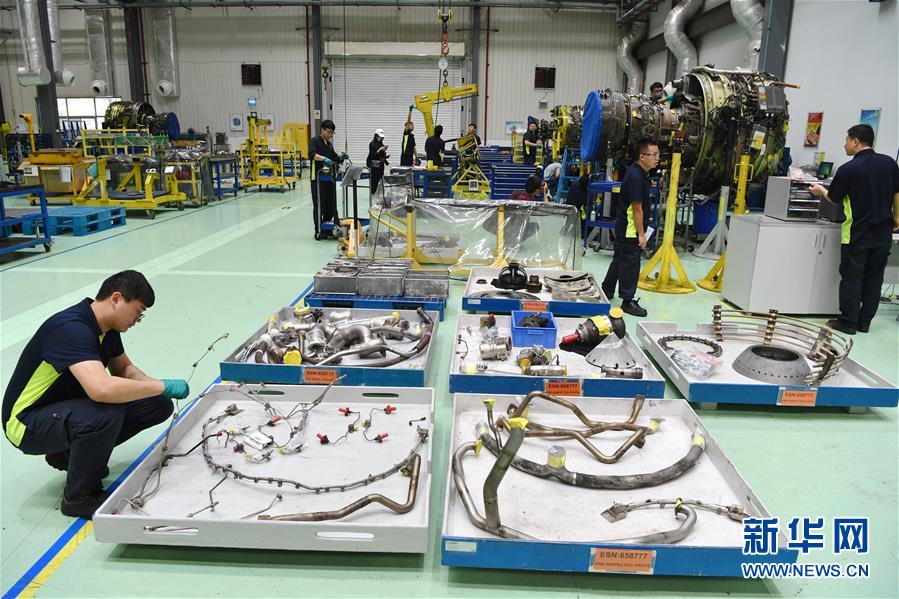 11月15日,在福建自貿(mào)區(qū)廈門片區(qū)的新科宇航科技有限公司航空維修車間內(nèi),技術(shù)人員維修飛機發(fā)動機。 新華社記者姜克紅攝