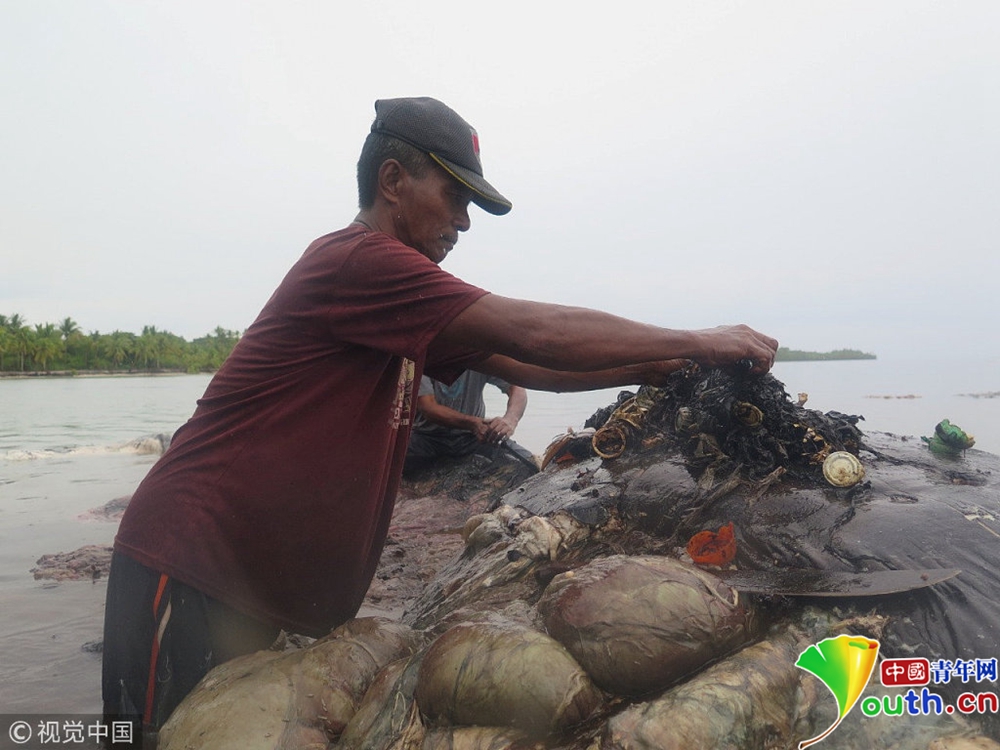 鯨魚擱淺印尼海岸 肚子里滿是塑料垃圾