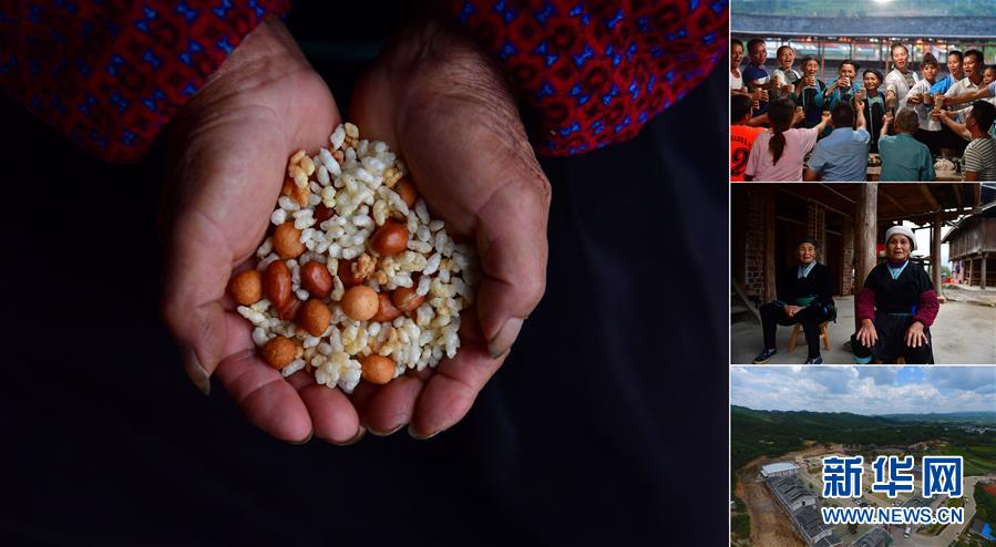 拼版照片:左圖為在廣西融水雙龍溝森林旅游度假區(qū)夢嗚苗寨,70歲的韋院媽手捧油茶原料:花生、油果、蔭米(11月20日攝);右上圖為韋院媽(左六)在景區(qū)里和游客們一起歡度苗族新禾節(jié)(7月18日攝);右中圖為韋院媽(右)在家里休息(11月20日攝);右下圖為夢嗚苗寨(7月19日無人機(jī)拍攝)。韋院媽是桿洞鄉(xiāng)錦洞村的貧困戶,今年3月,她和村里的13戶貧困戶一起舉家搬到雙龍溝森林旅游度假區(qū)打造的夢嗚苗寨,景區(qū)將貧困戶引入苗寨生活工作,保證貧困家庭有穩(wěn)定的收入。 廣西融水苗族自治縣是國家扶貧工作重點(diǎn)縣,全縣“九山半水半分田”,生活生產(chǎn)環(huán)境較為惡劣,脫貧攻堅(jiān)任務(wù)艱巨,目前還有7.68萬貧困人口。面對經(jīng)濟(jì)發(fā)展落后、貧困面廣且程度深的現(xiàn)狀,當(dāng)?shù)匕衙撠毠?jiān)與創(chuàng)新產(chǎn)業(yè)扶持相結(jié)合,依托生態(tài)資源優(yōu)勢,實(shí)施“特色產(chǎn)業(yè)富民行動”,通過發(fā)展特色民族旅游、林下經(jīng)濟(jì)和特色養(yǎng)殖業(yè)等扶貧產(chǎn)業(yè),帶動貧困群眾依靠勤勞的雙手,拔窮根摘窮帽,實(shí)現(xiàn)脫貧致富。據(jù)了解,目前全縣貧困戶參與特色產(chǎn)業(yè)發(fā)展的有2.9萬戶,扶貧產(chǎn)業(yè)覆蓋率達(dá)95%。 新華社記者 黃孝邦 攝