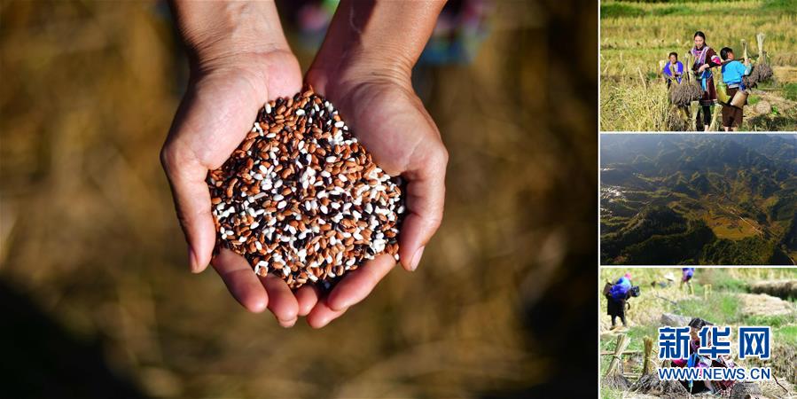 拼版照片:左圖為在安太鄉(xiāng)元寶村,80歲的賈榮專手捧剛剛收獲的香糯;右上圖為成熟待收的香糯;右中圖為賈榮專(左)在收割香糯;右下圖為村民們在收香糯(照片均攝于10月30日)。2017年,賈榮專加入村里的香糯種植合作社。香糯是廣西融水大苗山的特產(chǎn),它生長在高寒高海拔的特殊自然環(huán)境中,產(chǎn)量少,營養(yǎng)價值高。 廣西融水苗族自治縣是國家扶貧工作重點(diǎn)縣,全縣“九山半水半分田”,生活生產(chǎn)環(huán)境較為惡劣,脫貧攻堅(jiān)任務(wù)艱巨,目前還有7.68萬貧困人口。面對經(jīng)濟(jì)發(fā)展落后、貧困面廣且程度深的現(xiàn)狀,當(dāng)?shù)匕衙撠毠?jiān)與創(chuàng)新產(chǎn)業(yè)扶持相結(jié)合,依托生態(tài)資源優(yōu)勢,實(shí)施“特色產(chǎn)業(yè)富民行動”,通過發(fā)展特色民族旅游、林下經(jīng)濟(jì)和特色養(yǎng)殖業(yè)等扶貧產(chǎn)業(yè),帶動貧困群眾依靠勤勞的雙手,拔窮根摘窮帽,實(shí)現(xiàn)脫貧致富。據(jù)了解,目前全縣貧困戶參與特色產(chǎn)業(yè)發(fā)展的有2.9萬戶,扶貧產(chǎn)業(yè)覆蓋率達(dá)95%。 新華社記者 黃孝邦 攝