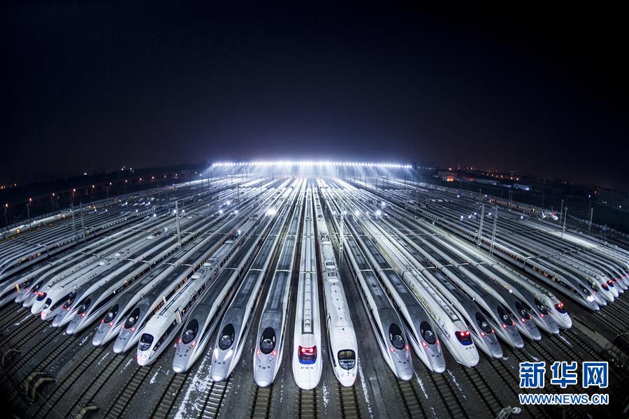 2018年2月1日凌晨,動(dòng)車組停靠在武漢動(dòng)車段的存車線上,準(zhǔn)備進(jìn)行檢修和保溫作業(yè)。近百組在武漢動(dòng)車段經(jīng)過檢修、保溫作業(yè)的動(dòng)車組蓄勢待發(fā),迎接春運(yùn)。新華社記者 肖藝九 攝