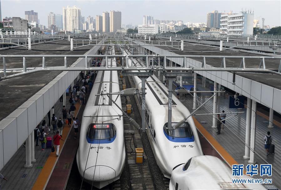 在廣西南寧站,旅客進(jìn)入站臺(tái)準(zhǔn)備乘坐動(dòng)車出行(9月4日攝)。 廣西壯族自治區(qū)成立60年來,鐵路建設(shè)發(fā)生翻天覆地的變化。來自中國鐵路南寧局集團(tuán)有限公司的數(shù)據(jù)顯示,1958年廣西鐵路總里程為1346.3公里,如今廣西鐵路總里程達(dá)5191公里。廣西與周邊相鄰省份間實(shí)現(xiàn)動(dòng)車“公交化”開行。此外,北部灣港—重慶班列、東盟海產(chǎn)品冷鏈班列、“百色一號(hào)”果蔬專列等的開通和運(yùn)營,強(qiáng)化了鐵路供給的針對性和有效性。鐵路成為助推廣西經(jīng)濟(jì)社會(huì)快速發(fā)展的“大動(dòng)脈”。 新華社記者陸波岸攝