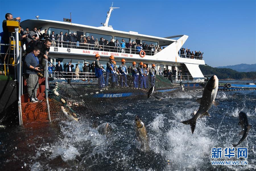 當(dāng)日,浙江省杭州市淳安縣千島湖中心湖區(qū)上演巨網(wǎng)捕魚,30余名捕撈隊員經(jīng)過半個多小時拉網(wǎng),獲得大豐收。