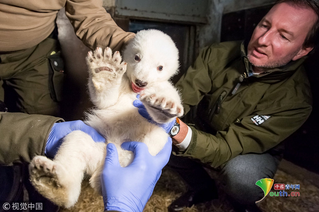當?shù)貢r間2017年1月12日,德國柏林,柏林蒂爾加滕動物園為一只雄性北極熊寶寶檢查身體。熊寶寶于2016年11月3日出生,身高67厘米,體重4.6千克。