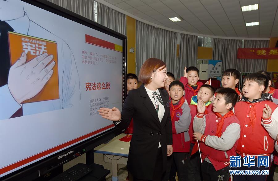 12月3日,合肥市經開區(qū)明珠居委會法律援助律師在給明珠小學的學生們講解憲法知識。國家憲法日到來之際,各地學校紛紛舉辦主題宣講活動,對學生開展法治教育,幫助孩子們了解憲法知識。新華社記者 郭晨 攝