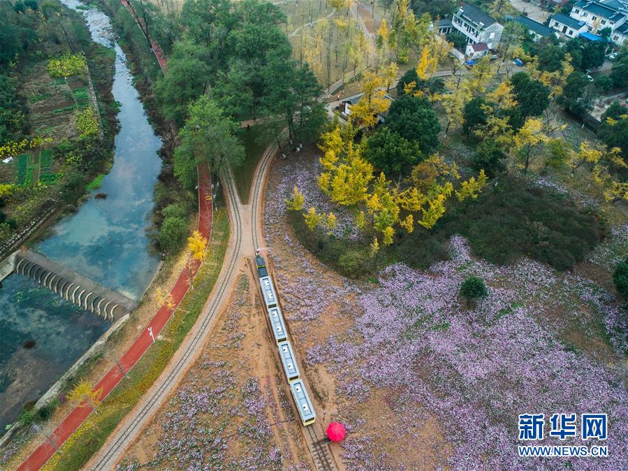 一列觀光小火車帶著游客穿行在銀杏林和花海之間(11月16日無人機(jī)拍攝)。近日,在浙江省長興縣小浦鎮(zhèn),“十里銀杏長廊”和近千畝花海經(jīng)過近一年的升級改造后,以嶄新的面貌與游客見面?;ê?、觀光小火車、古村民宿、銀杏長廊等旅游項(xiàng)目全面提升了小浦鎮(zhèn)鄉(xiāng)村旅游的品質(zhì)。新華社記者 徐昱 攝