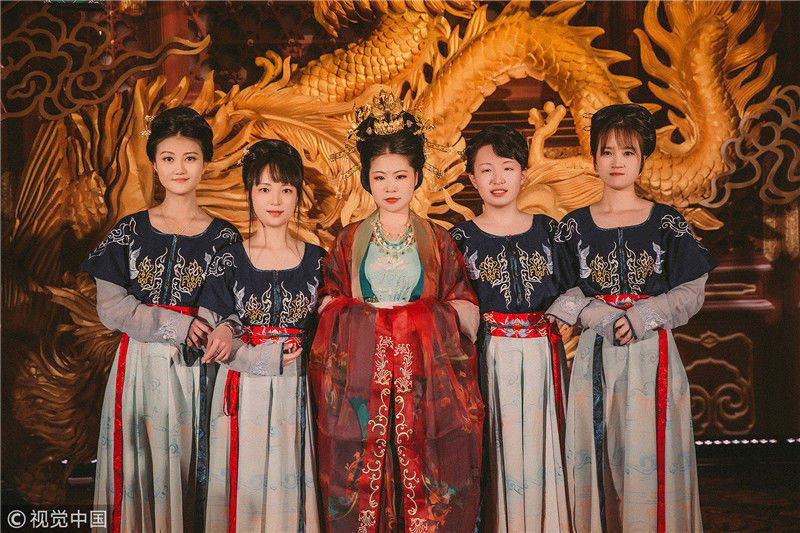 婚禮開始,隨著一聲“新婿、新婦正婚大典開禮!掌燈!”兩名侍女提宮燈在前面開道,兩名執(zhí)事手捧大雁跟隨,然后是新人緊隨。新人身后是兩侍女手持沃盥用具,兩執(zhí)事持裝肉的食盤、酒壺,走在最后面。圖為在婚禮上,這些小姐妹都穿上漢服,像一個(gè)個(gè)漂亮的宮女。