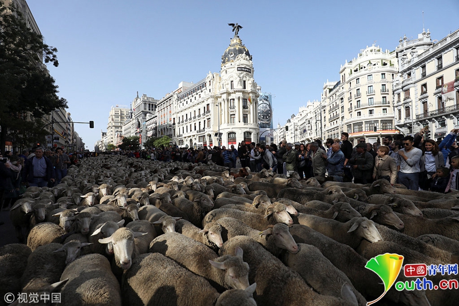 牧羊人驅趕成百上千只綿羊穿越馬德里市街。