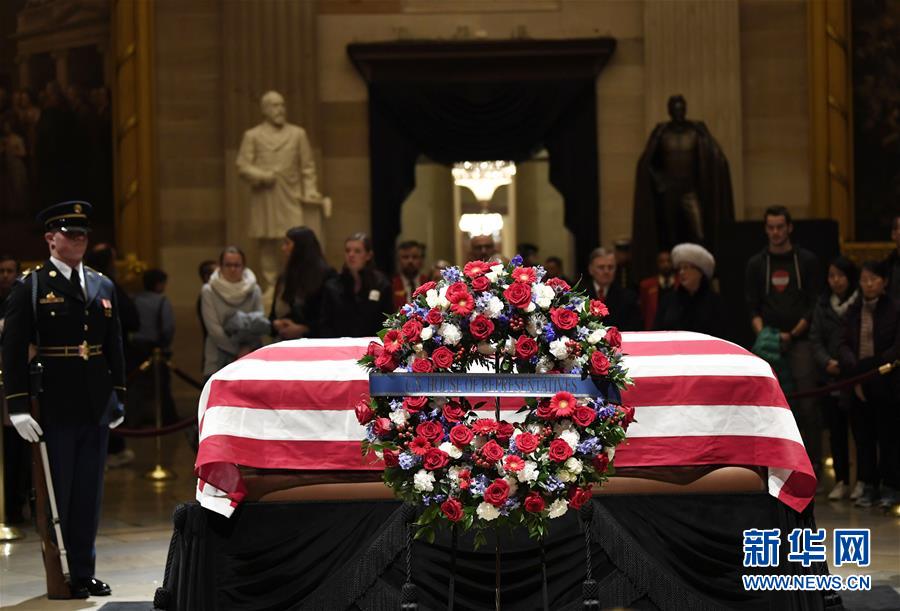美國前總統(tǒng)老布什的遺體3日下午運(yùn)抵首都華盛頓,安放在國會大廈圓頂大廳,接受吊唁。
