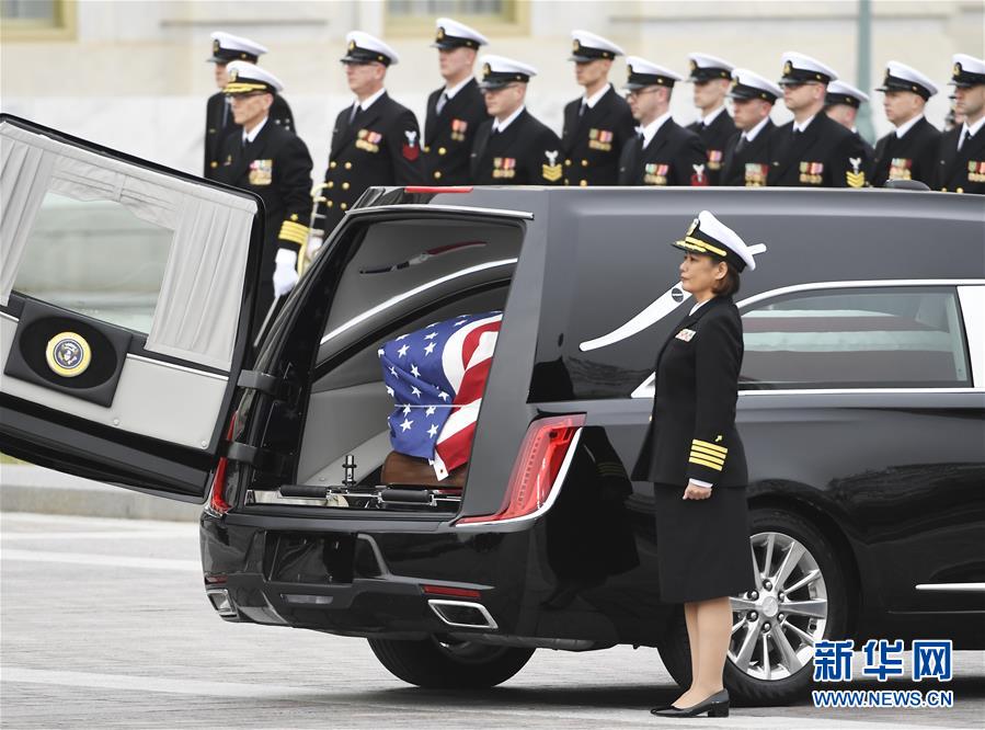 12月5日,在美國首都華盛頓,美國前總統(tǒng)喬治·赫伯特·沃克·布什的靈柩被安放在國會(huì)大廈前的靈車上。