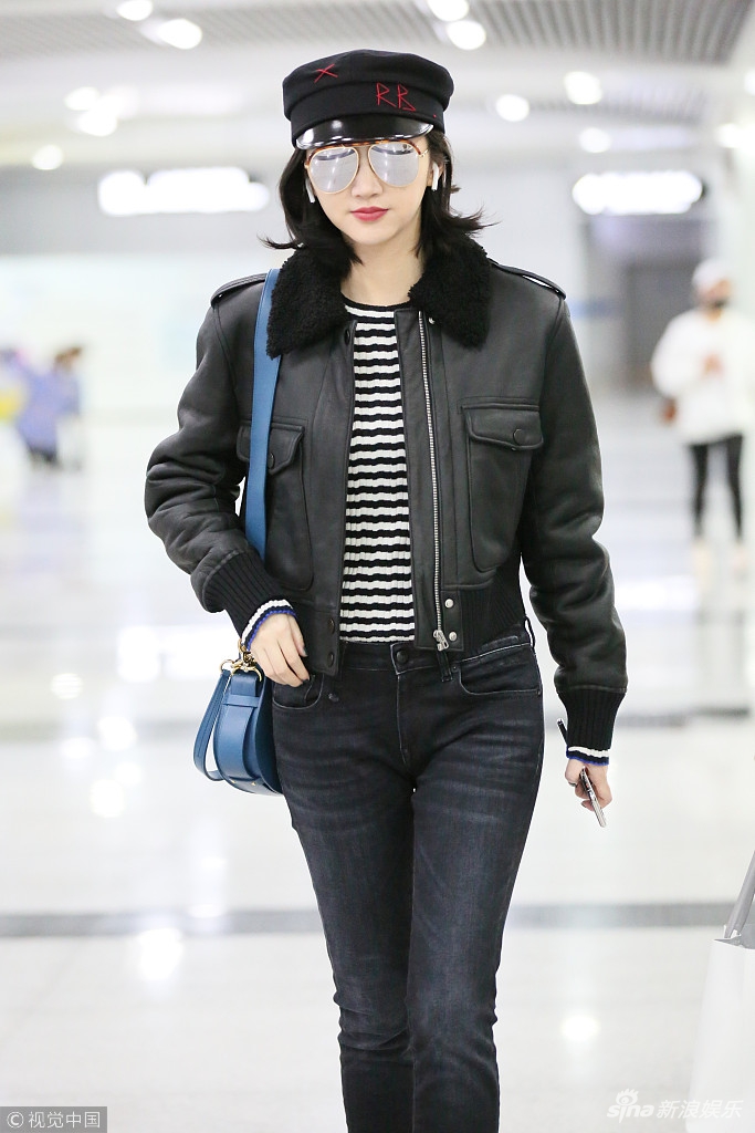 日前,景甜現(xiàn)身機(jī)場(chǎng),身穿黑色皮夾克超有范兒,戴小帽酷似甜美女軍官。視覺中國(guó)/圖