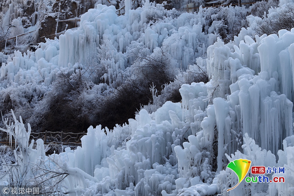 炭廠村神泉峽景區(qū)大面積人工冰瀑形成美麗的冰瀑景觀,預(yù)計12月19日正式向游客開放。