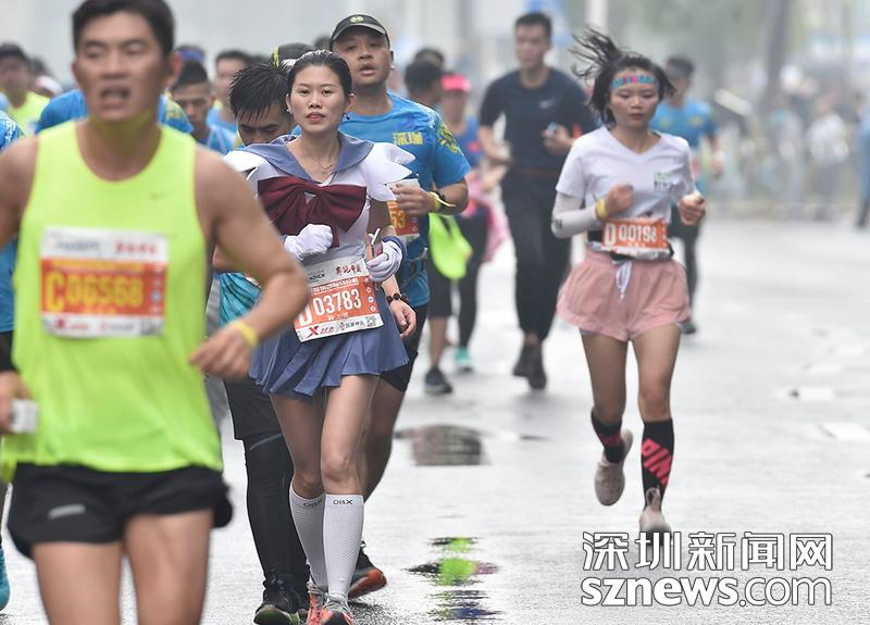 2018年12月16日,深圳國際馬拉松位于后海的折返點(diǎn),一名身著女仆裝的選手正在向終點(diǎn)沖刺。
