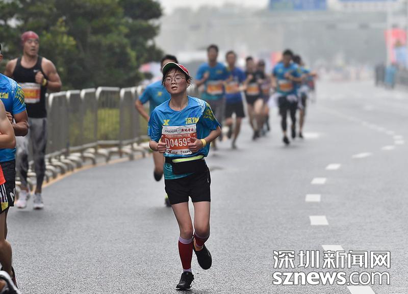2018年12月16日,深圳國際馬拉松位于后海的折返點,一名選手正在向終點沖刺。