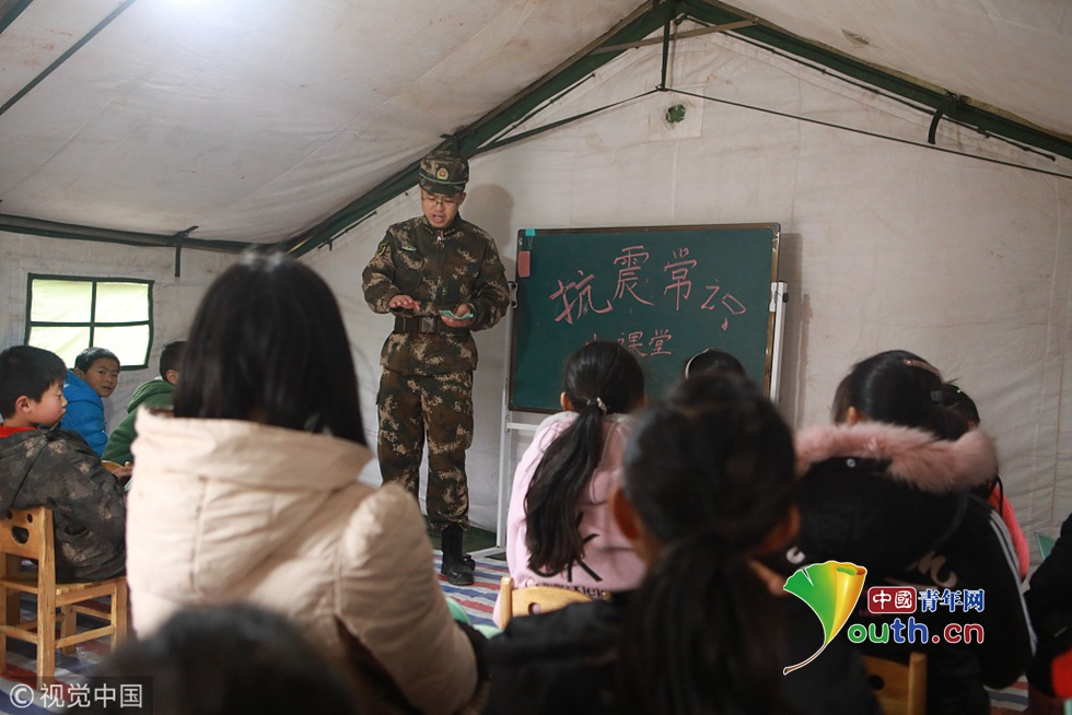 2018年12月18日,四川宜賓。武警宜賓支隊政治工作處宣傳保衛(wèi)股股長朵祝偉為周家鎮(zhèn)新塘安置點的“帳篷學(xué)校”的學(xué)生上抗震常識課。圖片作者:謝江、劉崇達(dá)/視覺中國
