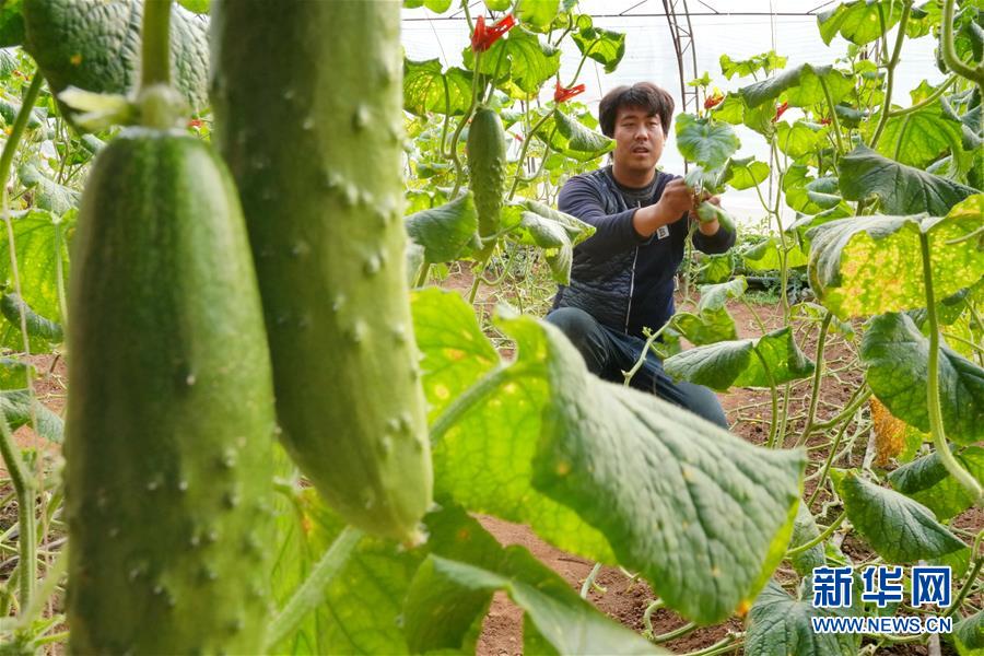 12月20日,唐山市豐潤(rùn)區(qū)百草坡農(nóng)產(chǎn)品農(nóng)民專業(yè)合作社社員在大棚內(nèi)管護(hù)黃瓜。