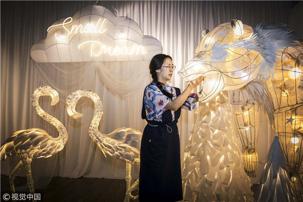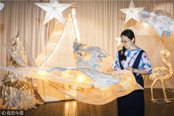 2018年5月6日,廣州,在天河區(qū)一家大商場(chǎng)辦個(gè)展時(shí),用紙片做成的北極熊、大松樹(shù)、火烈鳥(niǎo)、紙房子在光線的配合下美輪美奐,吸引了很多顧客駐足?!皫缀趺總€(gè)人一看到,都會(huì)走進(jìn)那個(gè)夢(mèng)幻的場(chǎng)景里,和這些紙雕一起合影?!眻D片攝于2018年5月6日。南塘/視覺(jué)中國(guó)