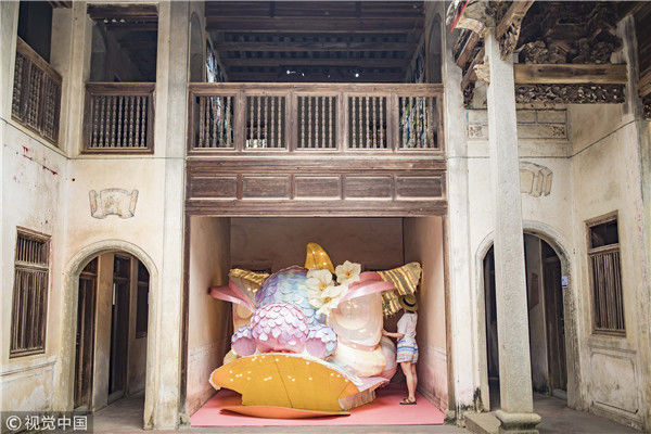 2018年8月10日,廣東揭陽(yáng),溫秋雯把獅子頭扒得只剩下骨架和包布,之后將不同顏色的紙片裁剪成三角形、鱗片形等不同形狀,作為裝飾獅子的皮毛,粘在獅子身上,獅子的鼻子則是用彩紙條以手鞠的方式纏繞而成,在獅頭內(nèi)部安裝了一盞白熾燈,一打開(kāi)電燈,萌態(tài)可掬的獅子便呈現(xiàn)在人們眼前。紙片的顏色以淡粉、淡綠、淺白色為主,就這樣,人們平時(shí)印象中威猛的南獅,被改裝得萌萌的。圖為2018年8月10日,廣東省梅州市,溫秋雯和她的紙雕作品。
