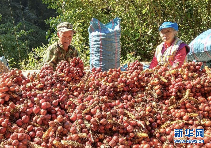 獨龍江鄉(xiāng)馬庫村村民在整理收獲的草果,準備賣到外地市場(2018年11月10日攝)。  新華社發(fā)(楊時平 攝)