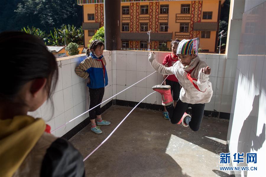 在獨龍江鄉(xiāng)中心小學,孩子們在跳皮筋(2016年11月23日攝)。  新華社記者 胡超 攝