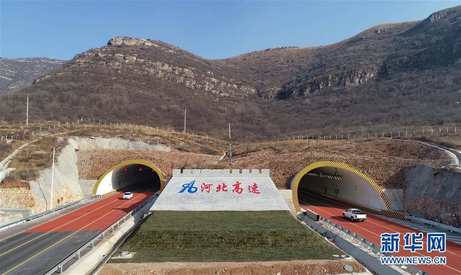 12月16日,兩輛汽車行駛在京秦高速公路二期工程河北玉田境內(nèi)的鳳凰頂隧道路段(無人機(jī)拍攝)。 新華社記者楊世堯攝