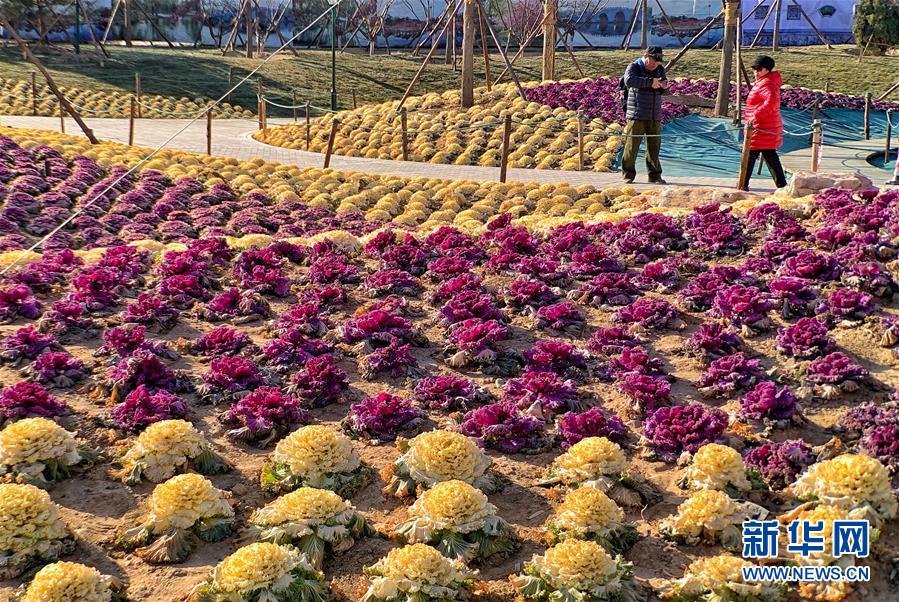12月24日,游人在北京玉淵潭公園觀賞甘藍。 日前,北京市玉淵潭公園移栽的三萬多棵紫色和黃色羽衣甘藍盛開,為冬季公園增添了色彩。 新華社記者李欣攝