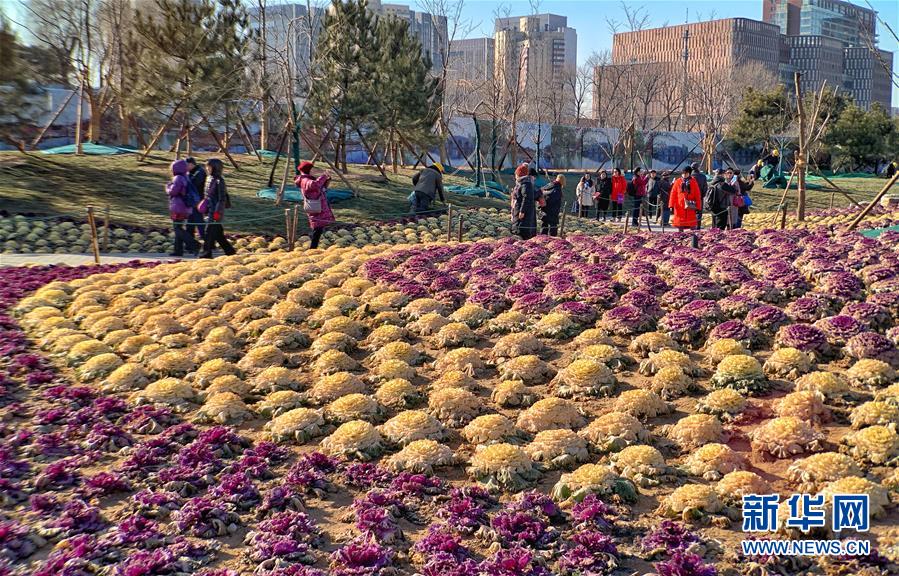 12月24日,游人在北京玉淵潭公園觀賞甘藍。 日前,北京市玉淵潭公園移栽的三萬多棵紫色和黃色羽衣甘藍盛開,為冬季公園增添了色彩。 新華社記者李欣攝