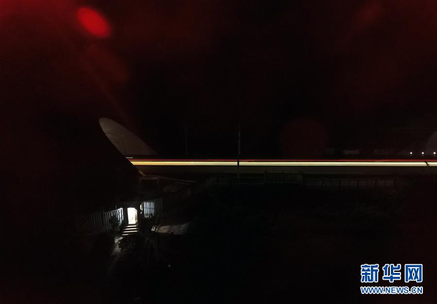 一列動(dòng)車夜間穿越花甲山隧道進(jìn)入壇柱隧道(左)(2月11日無(wú)人機(jī)航拍)。廣西南寧市前往北部灣沿海城市的鐵路,穿越巍巍群山,列車飛馳其間需要穿過(guò)大批隧道,僅南寧市到北海市的鐵路隧道就有18個(gè)。