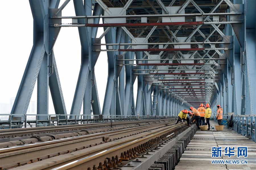 線路工們?cè)谀暇╅L(zhǎng)江大橋鐵路橋進(jìn)行木枕改道作業(yè)(12月27日攝)。