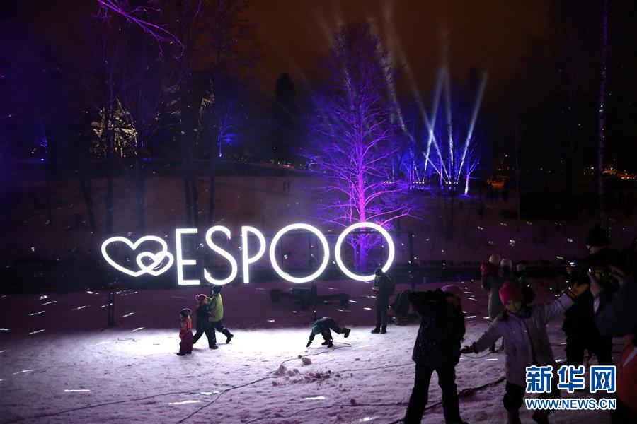 2018年12月31日,在芬蘭南部城市埃斯波,人們?cè)跓艄恻c(diǎn)綴的公園內(nèi)玩耍。