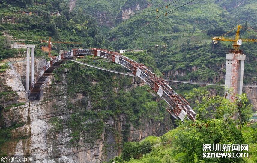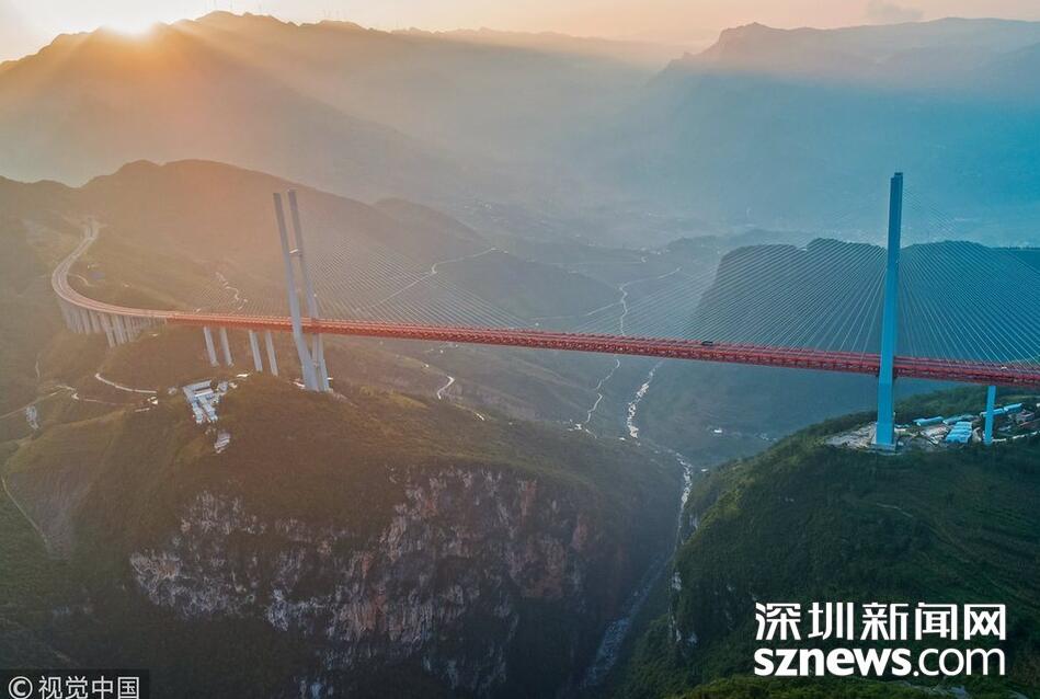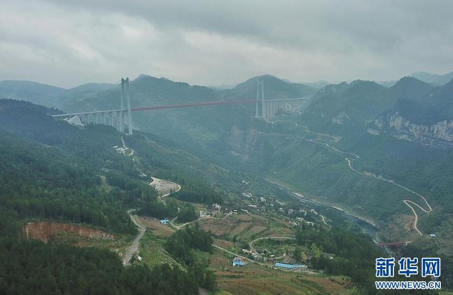畢都高速公路北盤(pán)江大橋是杭瑞高速公路畢都段的控制性工程,位于貴州省和云南省交界處,由貴州省和云南省共建。該橋橋面至江面高差達(dá)565米,成為目前世界第一高橋。主橋?yàn)殇撹炝盒崩瓨?,主?20米,目前位居同類型橋梁2016年12月29日正式通車。
